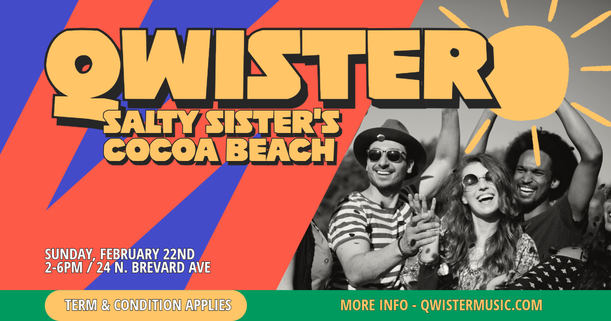 Qwister Solo Live at Salty Sister’s / Cocoa Beach, FL / Sunday, February 22nd / 2-6pm Qwister Solo February 22, 2026 Cocoa Beach, FL (Sunday Afternoon) Free facebook Details Time : 2-6pm Venue : Salty Sisters Bar & Grill Address : 24 N Brevard Ave. State : FL Zip : 32931 Phone : +13216132474 Contact Email : ryangmelquist@gmail.com Contact Website : https://saltysisterscb.com/