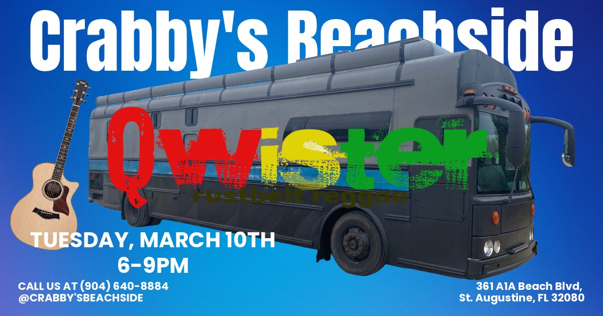 Qwister Solo @ Crabby’s Beachside / St. Augustine, FL / Tuesday, March 10th / 6-9pm Qwister Solo March 10, 2026 St. Augustine, FL (Tuesday Night) Free facebook Details Time : 6-9pm Venue : Crabby's Beachside Address : 361 A1A Beach Blvd. State : FL Zip : 32080 Phone : +19046408884 Contact Email : ryangmelquist@gmail.com Contact Website : https://crabbysbeachside.com/